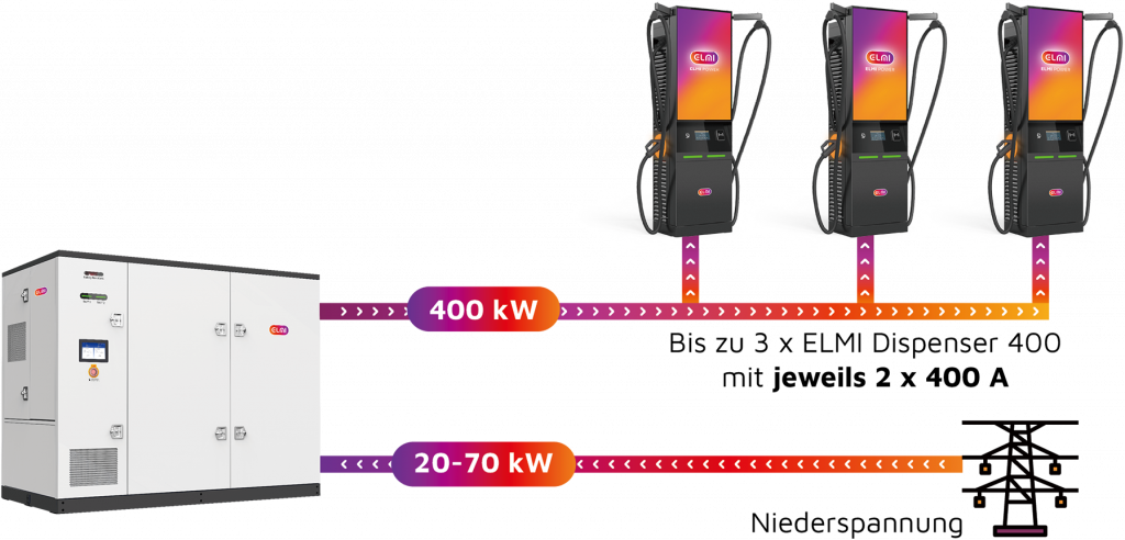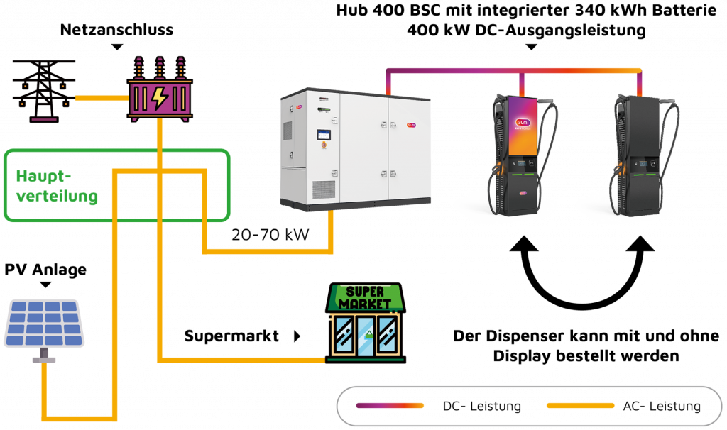 Das Hub400-System trennt Batteriespeicher (340 kWh) und Ladestationen räumlich: Der Hub liefert 400 kW DC-Leistung an bis zu 3 Dispenser (6 Ladepunkte) über Distanzen bis 100 Meter – bei nur 20-70 kW Netzanschluss. Verdient 24h an 7 Tage der Woche Geld.