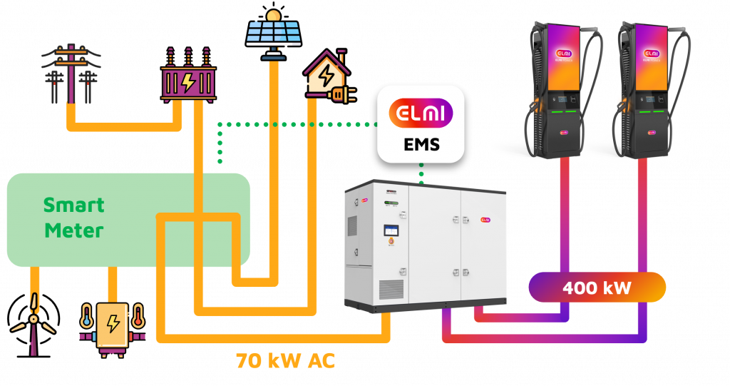 Über die Schnittstelle ModbusTCP kann das ELMI-Produkt durch das EMS jetzt gesteuert werden: so ermöglicht die Batterie nicht nur Schnellladen mit bis zu 400 kW trotz 70 kW Netzanschluss, sondern steht gleichzeitig für weitere Optimierungen zur Verfügung. Als zentrale Speichereinheit nimmt sie Energie von Verbrauchern auf, puffert diese und gibt sie genau dann wieder ab, wenn die Netzlast hoch ist oder die Stromkosten Spitzenwerte erreichen. Dadurch wird die vorhandene Energie optimal genutzt und die Leistungsfähigkeit Ihres Systems deutlich erhöht.