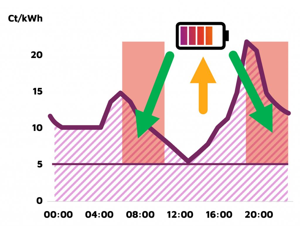 Mit dynamischen Strompreisen kann die Batterie gezielt in Zeiten niedriger Börsenpreise geladen werden. Ist der Strompreis hoch, versorgt die Batterie Ihren Standort, sodass deutlich weniger Strom aus dem Netz bezogen werden muss. Auf diese Weise können Sie Ihre Stromkosten um bis zu 7 ct / kWh reduzieren.